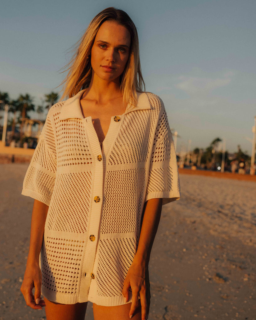 The Cool Down Short Sleeve Sweater by Billabong offers a breezy and airy feel, perfect for warm days. Crafted with an open stitch weave and featuring an oversized silhouette, this sweater is both stylish and comfortable. The front button placket and metal plate details provide a polished look to this short sleeve staple.