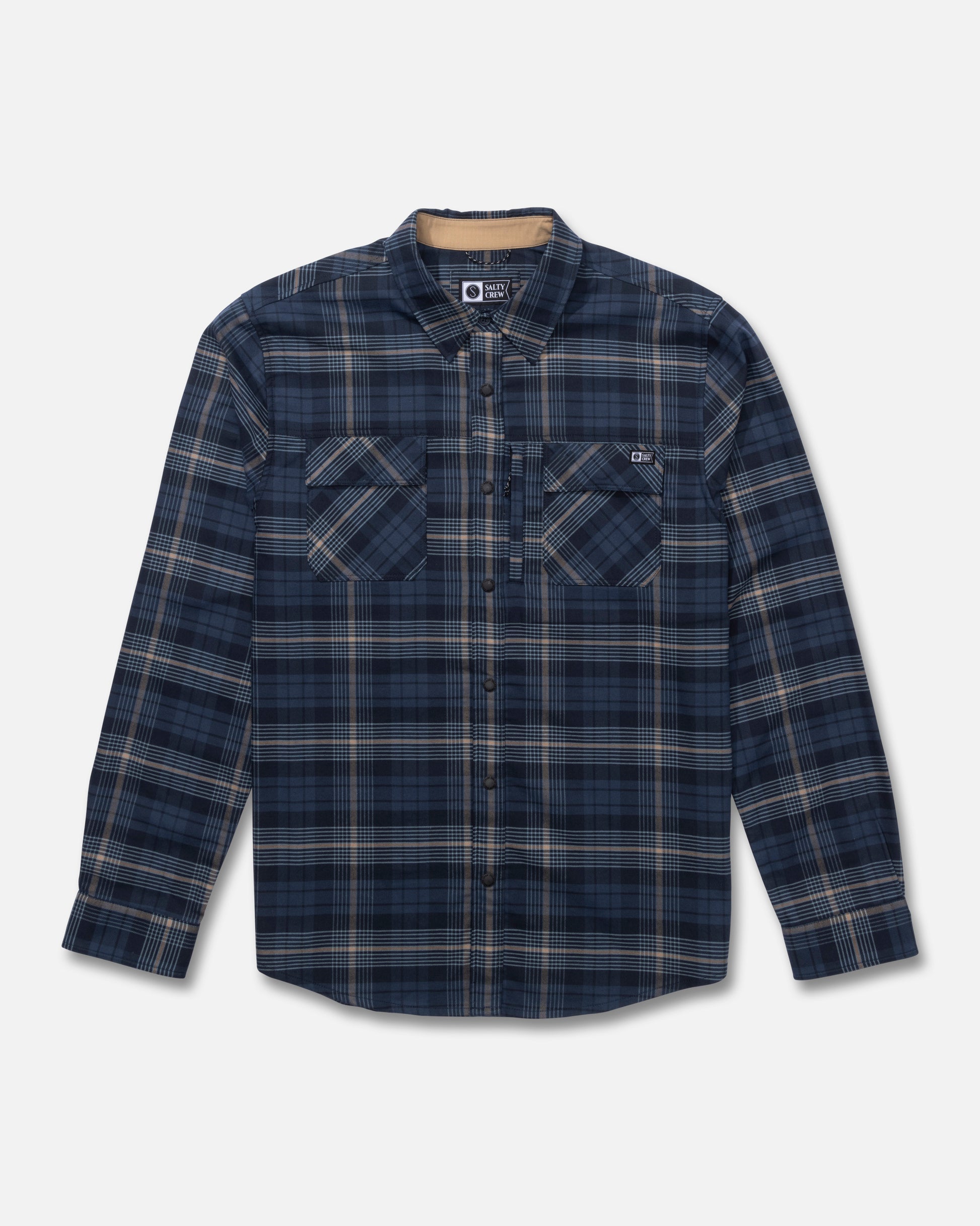 Adding to its utility, the Fathom LS Tech Flannel features a handy utility zipper chest pocket along with dual chest pockets with button flaps, providing ample storage for your essentials. The iconic Salty Crew label adorns the left chest pocket, adding a touch of brand authenticity to this rugged classic. The shirt also boasts a snap front closure with branded snaps, a collar neck, and long sleeves with snap cuffs, combining practicality with a timeless design.